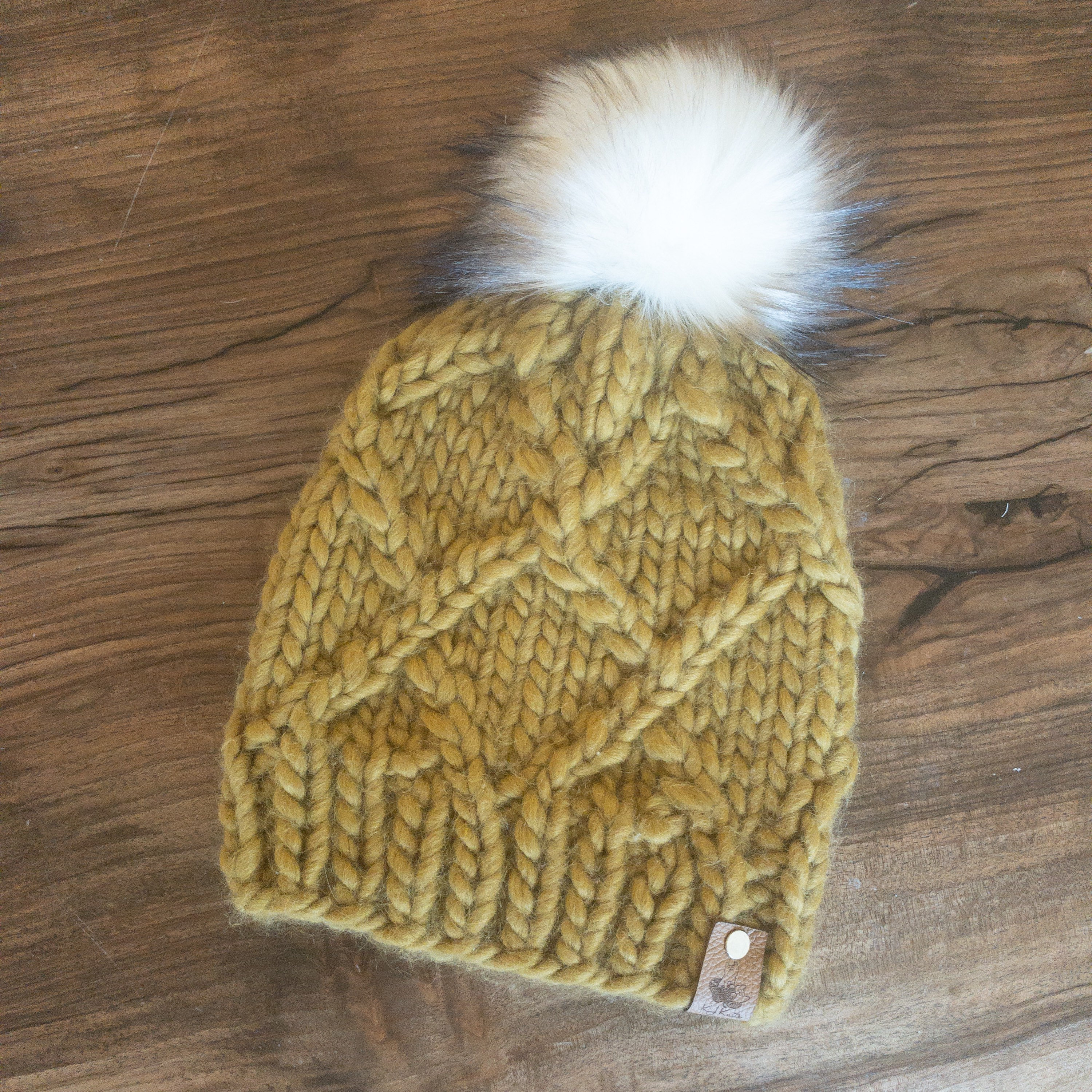 Hand-knit merino wool hat made with 50% superwash wool 45% Acrylic 5% Viscose. Includes a 6 inch faux fur pom pom. Fits most adult women